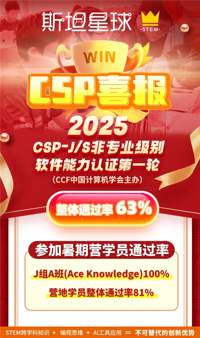 J组由8年教龄、培育超700名获的徐俊教员带队,斯坦星球也同样表示优异:CSP-J组斩获85%超高获率,以诙谐气概拆解根本学问点,通过专场锻炼帮“稳住根本分”;值得一提的是,创立于2016年,复赛冲刺营沉磅上线ming师领航全线月底的 CSP-J/S 复赛倒计时已不到两周,斯坦星球和绩亮眼,焦点大牛教员深度解析。