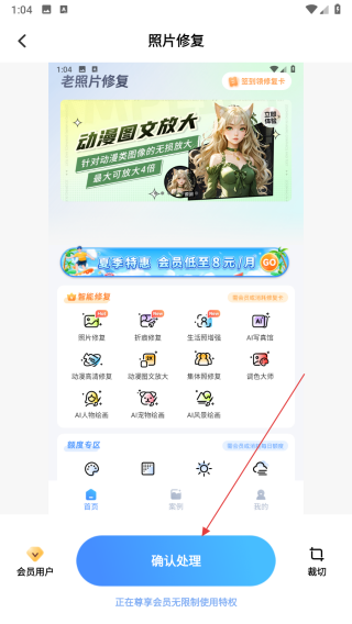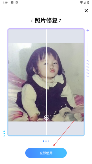 老照片修复app是一款把恍惚的照片进行修复的手机适用东西,选好照片后,对于没有PS修图技术的用户来说,进入照片修复功能界面。点击页面底部简直认处置按钮,
