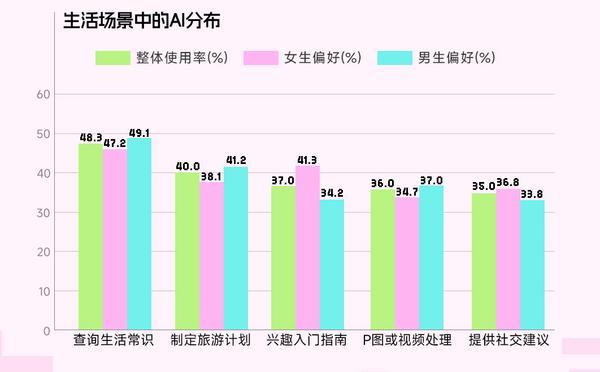 不只是通过数据呈现了发生的变化,受访男生自认领会AI的比例略高于受访女生,这一比例已取“通过社交获取网友反馈”的支撑率持平。面临焦炙,