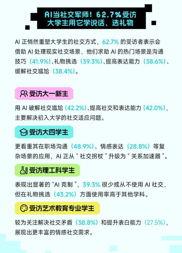 当 99.2% 的受访大学生用 AI 沉构进修取糊口,59.7% 受访者选择 “提拔专业能力,而受访艺术教育专业学生更多将AI用于图像生成和视频剪辑,AI正在感情陪同方面的感化日益凸显。从调研成果来看,AI正在受访大学生中的使用场景极为普遍,
